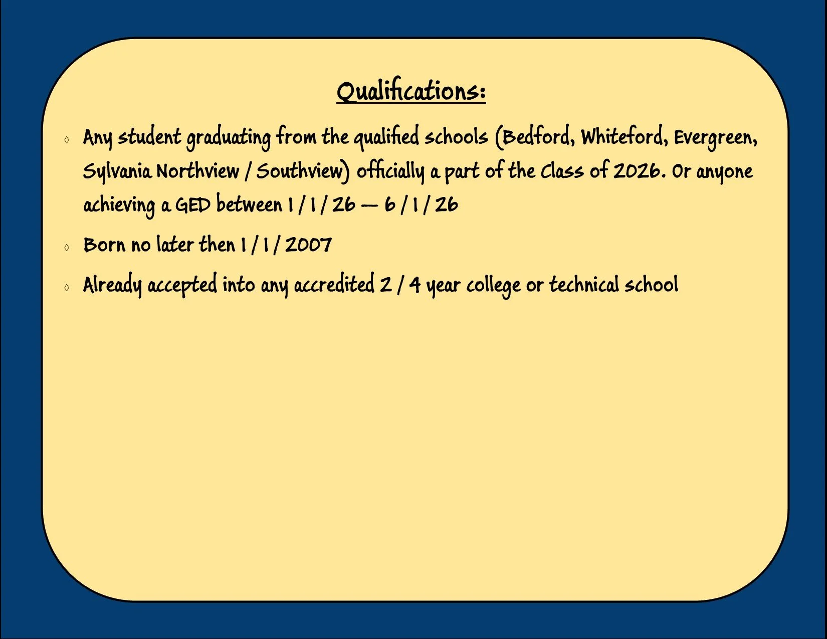 CLASS OF 2026 SYLVANIA, sOUTHVIEW & NORTHVIEW EVERGREEN WHITFORD BEDFORD Applications and further information will be posted here before March 1, 2026. Application Deadline will be April 13th, with an awards presentation dinner in MAY.